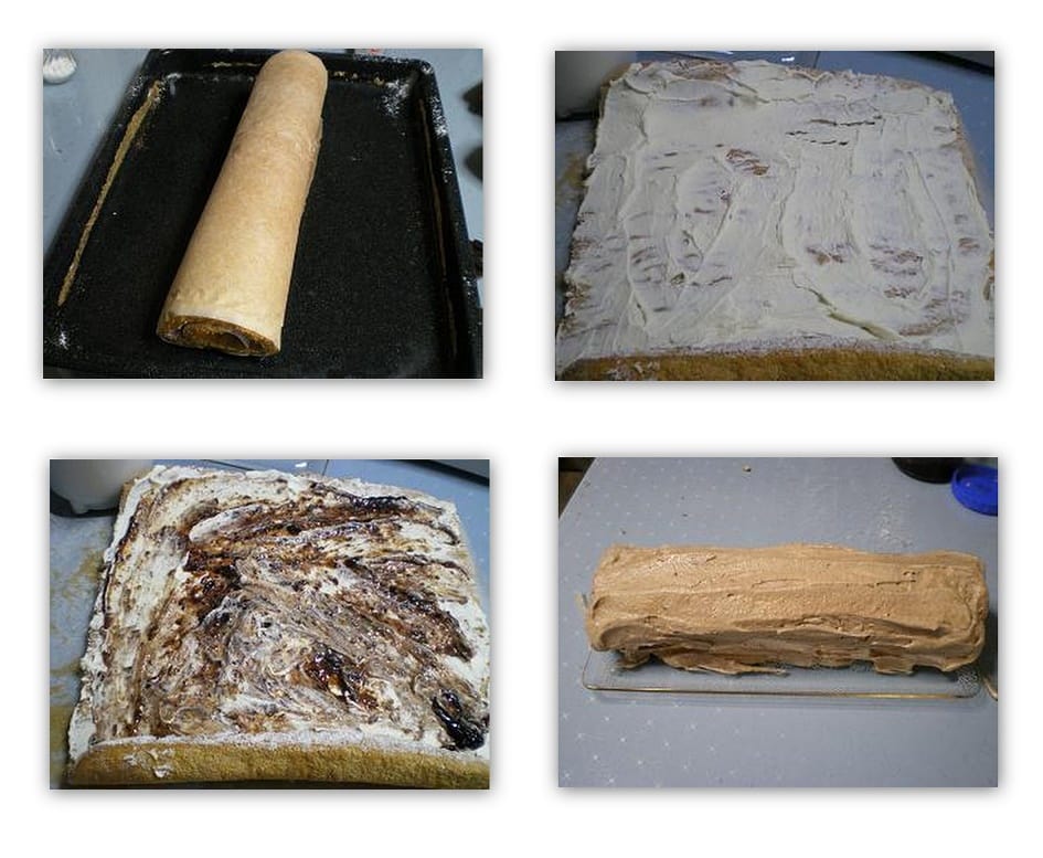 5. Αφού κρυώσει το παντεσπάνι το ξετυλίγουμε προσεκτικά και αλείβουμε με τη μισή κρέμα σαντιγί.  Μπορεί να σπάσει το παντεσπάνι αλλά μη φοβηθείτε, δεν θα φαίνεται μετά..
