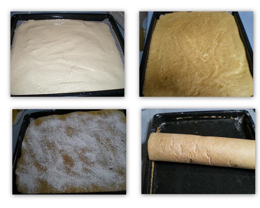 3. Μόλις γίνει το παντεσπάνι το πασπαλίζουμε με ζάχαρη άχνη και όπως είναι ζεστό το τυλίγουμε σε ρολό, μαζί με το χαρτί και το αφήνουμε να κρυώσει.
