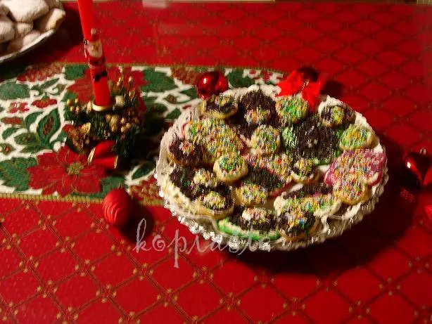 Ετοίμασα τους κουραμπιέδες μου όπως τους κάνω συνήθως (με μια μικρή παραλλαγή) αλλά στη ζύμη για τα Μπισκότα Καλειδοσκόπιο πρόσθεσα λίγη ζάχαρη παραπάνω γιατί οι κουραμπιέδες από μόνοι τους είναι σχετικά άγλυκοι. Κράτησα το ασπράδι, το οποίο το κτύπησα σε ελαφριά μαρέγκα, πρόσθεσα μια βανίλια και ζάχαρη άχνη, μέχρι να γίνει ένα πηκτό γλάσο, το οποίο τοποθέτησα στο ψυγείο μέχρι να κρυώσουν τα μπισκότα. Μόλις κρύωσαν τα άλειψα μια φορά με μια στρώση. Στη συνέχεια μοίρασα τη δόση σε δύο φλιτζανάκια και έβαλα στο καθένα από μια σταγόνα χρώμα ζαχαροπλαστικής. Τα άλειψα και με λίγο χρώμα και τα πασπάλισα με την τρούφα προσπαθώντας να κάνω διαφορετικά σχέδια.