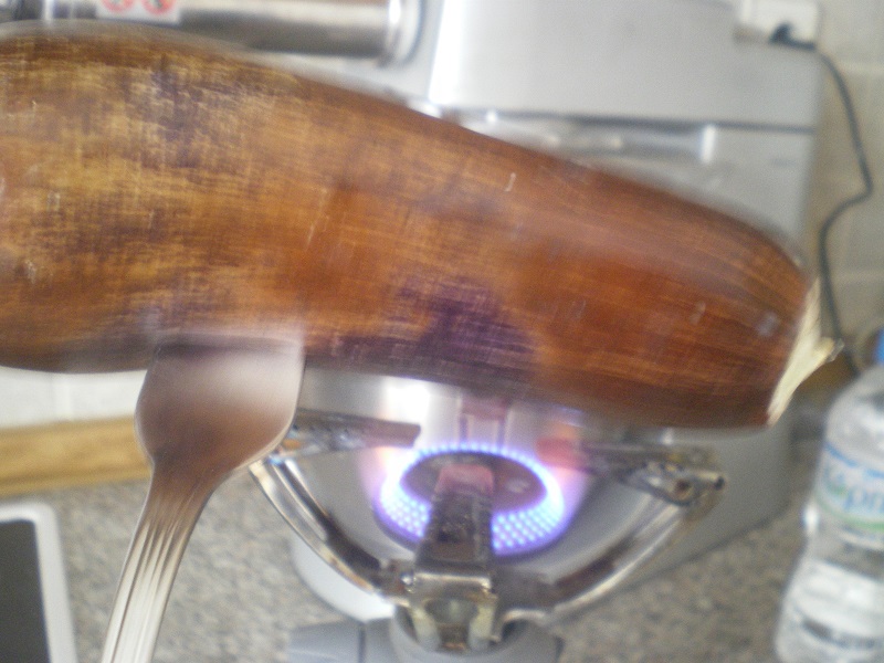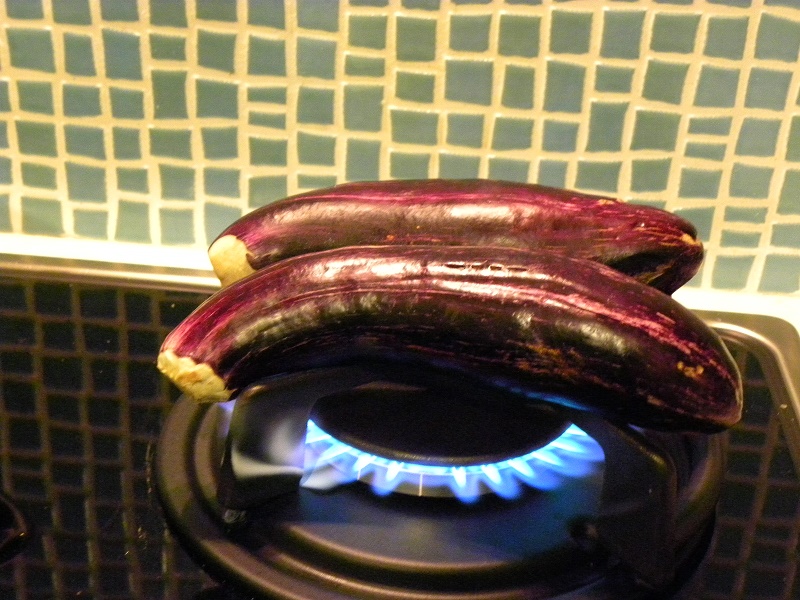 - Ψήνουμε την μελιτζάνα σε φλόγα γύρω στα 15 λεπτά μέχρι να μαυρίσει απ' έξω.