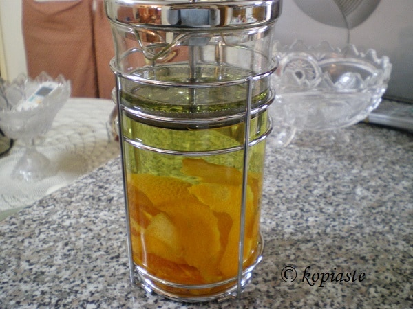 - Ξεφλουδίστε τα πορτοκάλια πολύ ψιλά, χωρίς το εσωτερικό άσπρο και τοποθετείστε σε μια κανάτα. Προσθέστε 3 ποτήρια αλκοόλ τσικουδιά, βότκα, ρακί, ζιβανία κλπ., και αφήστε το για δεκαπέντε ή περισσότερες ημέρες.