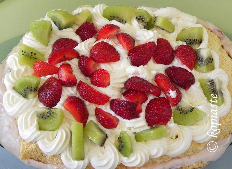 (Η φωτογραφία είναι πιο πρόσφατη, από άλλη συνταγή δική μου φτιαγμένη με δύο μαρέγκες και ανάμεσα έβαλα κρέμα φράουλας και από πάνω φράουλες και ακτινίδια).