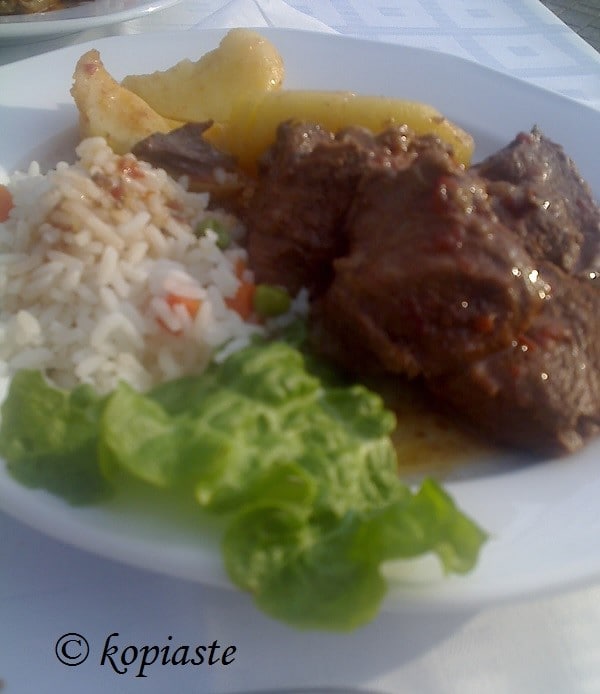 Επειδή στην Αθήνα δεν είναι δυνατόν να βρούμε βουβάλι, το έφτιαξα με μοσχάρι και ήταν ένα πολύ νόστιμο φαγητό. Η γεύση του βουβαλιού είναι παρόμοια με το βοδινό και εάν δεν ήξερα τότε ότι ήταν βουβάλι ούτε θα το καταλάβαινα.