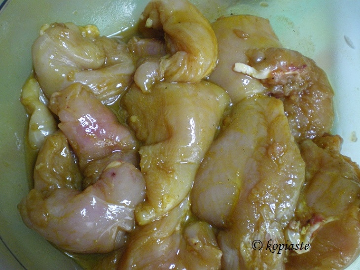 - Κόβουμε το κρέας σε κομμάτια και το βάζουμε σε ένα μπωλ μαζί με όλα τα υπόλοιπα υλικά και μπαχαρικά. Τα αφήσουμε να μαριναριστούν για τουλάχιστο τρεις ώρες ή όσες πιο πολλές ώρες μπορούμε.