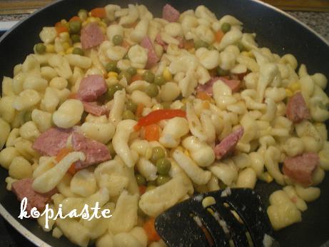Το πρώτο φαγητό που έφτιαξα ήταν αφού έρασα το αλλαντικό, κράτησα τα λαχανικά, έκοψα μερικές φέτες αλλαντικό και έβαλα τα βρασμένα ζυμαρικά στο τηγάνι με λίγο βούτυρο (εγώ έβαλα μαργαρίνη) και ανακάτεψα μέσα τα λαχανικά και το αλλαντικό με λίγο αλατοπίπερο.