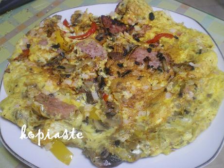 Το βράδυ σωτάρισα λίγο κρεμμύδι, μανιτάρια και διάφορες πιπεριές, λίγο αλάτι και πιπέρι harissa, έβαλα το αλλαντικό και αυγά και ένανα μια ομελέτα.
