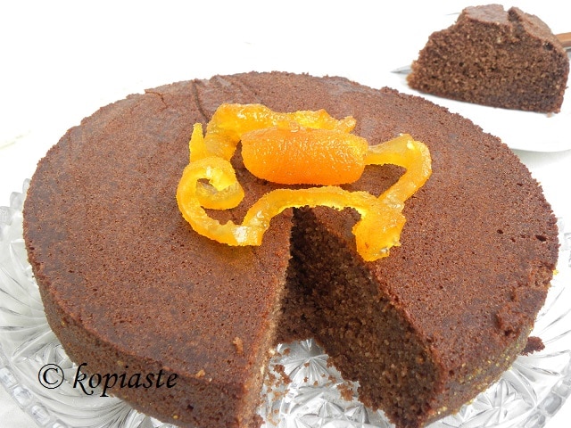 - Βγάζουμε το κέικ από το φούρνο και αφού κρυώσει λίγο το περιχύνουμε με το συρόπι.
