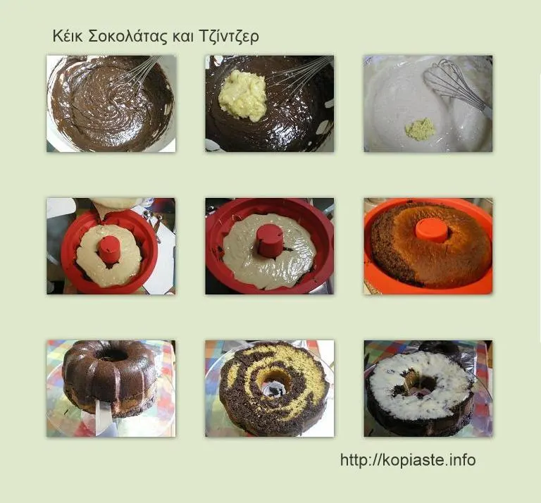 Αυτό το κέικ γίνεται πάρα πολύ εύκολα, δηλαδή ακόμη και ένα παιδάκι μπορεί να το φτιάξει.  Απλώς βάζουμε όλα τα υλικά σε ένα μπωλ και τα ανακατεύουμε το πολύ πέντε λεπτά.  Επειδή ήθελα να το κάνω δίχρωμο, μοίρασα το μείγμα και στο μισό έβαλα κακάο και στο άλλο τζίντζερ.   Αρχικά σκόπευα να βάλω ξύσμα πορτοκαλιού το οποίο είχα βάλει σε παγοκύστες στην κατάψυξη αλλά ξέχασα ότι είχα βάλει και τζίντζερ και έτσι έγινε το λάθος.  Το αποτέλεσμα όμως ήταν πολύ ωραίο γιατί όπως φαίνεται το τζίντζερ ταιριάζει πάρα πολύ με τη σοκολάτα αλλά το γλάσο είναι υπέροχο και κλέβει την παράσταση.
