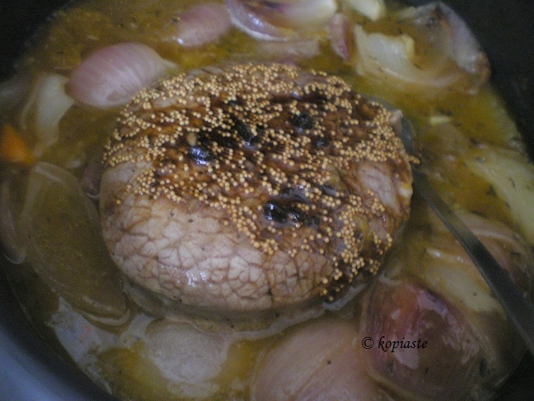 - Στη μία ώρα ψησίματος του φαγητού, διαλύουμε τη ζάχαρη, με το σινάπι και το ξύδι και τα ρίχνουμε πάνω στο κρέας και τα ανακατεύουμε καλά. Το ξανασκεπάζουμε.