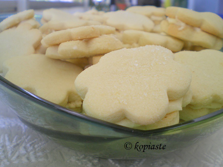Προσάρμοσα τη συνταγή γιατί ήθελα να κάνω πολύ περισσότερα από τη δοσολογία που έδινε και έκανα και μερικές μικροαλλαγές στη συνταγή, προσθέτοντας ξύσμα λεμονιού, επειδή μου αρέσει η γεύση του λεμονιού. Χρησιμοποίησα αλεύρι που φουσκώνει μόνο του, αντί για αλεύρι για όλες τις χρήσεις και πρόσθεσα και κόρν φλάουρ, όπως ανέφερε. Αφού έκοψα τα μπισκότα με κουπ-πατ και αφού τα έβαλα στο ταψί, τα πασπάλισα με λίγη ζάχαρη από πάνω.