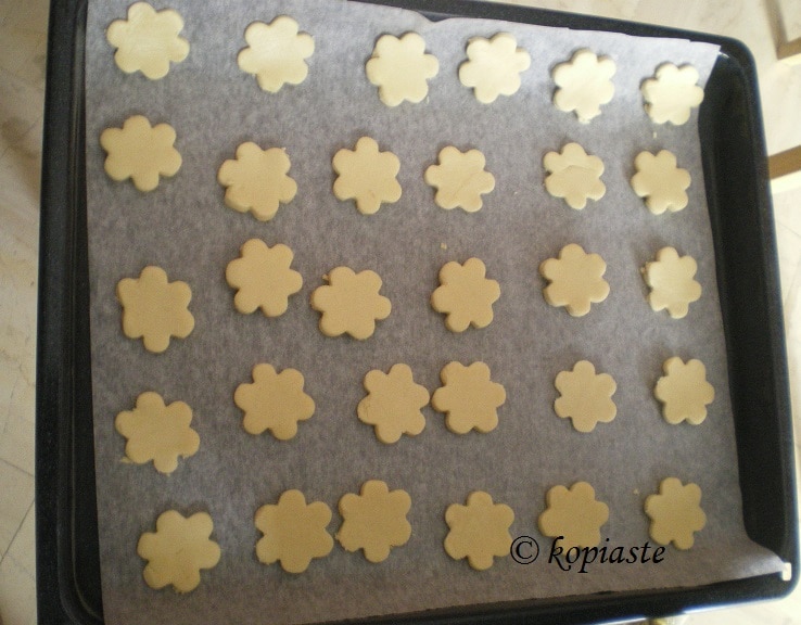 - Στρώνουμε λαδόκολλα σε ταψί και τοποθετούμε τα μπισκότα αφήνοντας κενό μεταξύ τους για να μην κολλήσουν όταν ψηθούν.
