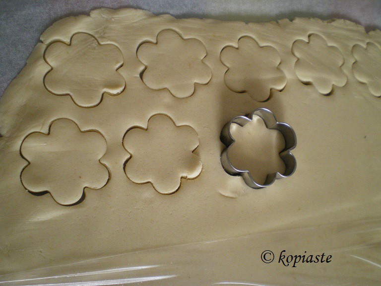 - Σε αντικολλητική επιφάνεια, βάζουμε τη ζύμη και από πάνω στρώνουμε μεμβράνη κουζίνας και ανοίγουμε το φύλλο στο πάχος που θέλουμε, περίπου 1/2 εκατοστό. Κόβουμε τα μπισκότα στο σχήμα που μας αρέσει και μαζεύουμε τα κομματάκια και τα ξαναζυμώνουμε.