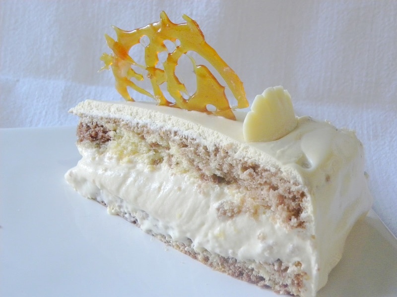 Τούρτα Καραμέλας, με δίχρωμο παντεσπάνι, γέμιση και επικάλυψη με κρέμα τυριού επικάλυψη λευκής σοκολάτας και με διακόσημηση καραμέλας και σοκολατάκια λευκής σοκολάτας.