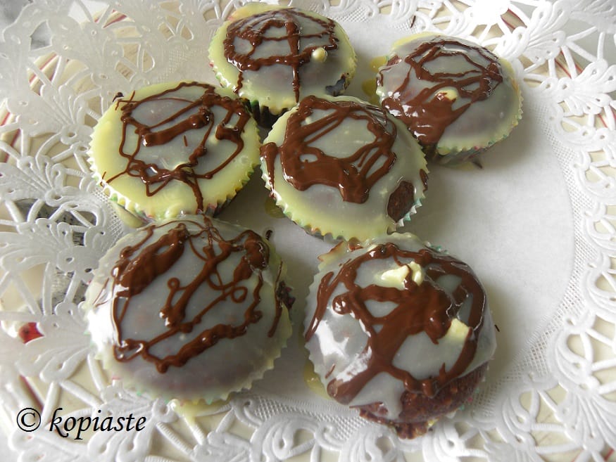 Τα τσουρέκια μου που τα γέμισα με πουρέ κάστανου τα έψησα χθες. Σήμερα, τα γλάσαρα με λευκή και σκούρα σοκολάτα. Έλιωσα μεγαλύτερη ποσότητα σοκολάτας και με την υπόλοιπη γλάσαρα το κέικ και τα μάφινς.