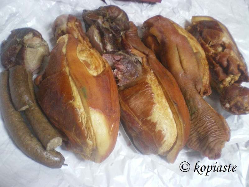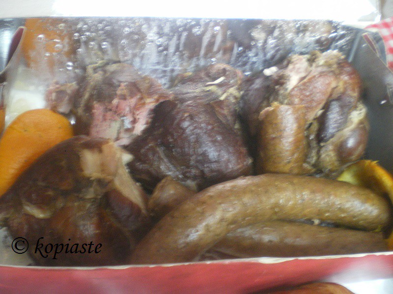 Εν τω μεταξύ πρόλαβε και ο γιος μου και αγόρασε και αυτός και παστό και λουκάνικα και μόλις είδα όλο αυτό το κρέας έμεινα. Εμείς πιο πολύ το τρώμε σαν μεζεδάκι, πού και πού και η ποσότητα που ζήτησα από το γιο μου θα μας έφτανε για κανένα εξάμηνο.