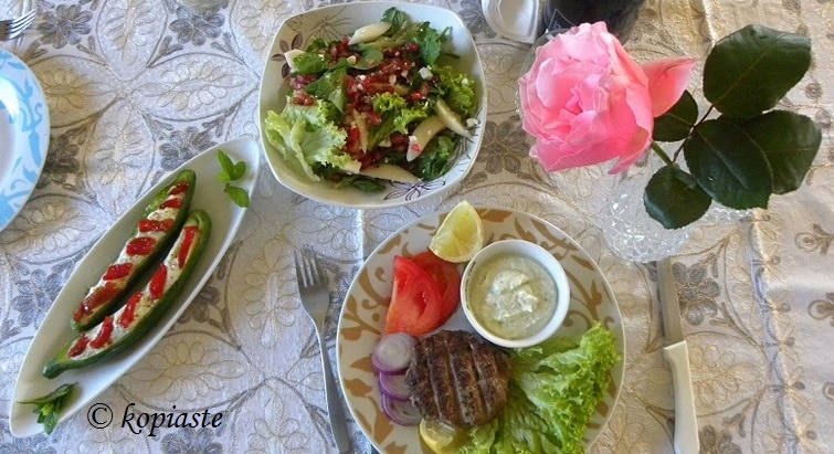 | Μεσημεριανό: | Σαλάτα:Πράσινη π.χ. μαρούλι, ρόκα, αρωματικά (απεριόριστη). Περιορισμό στις ντομάτες και στα βραστά λαχανικά. Βάζουμε: 1 κουταλιά ελαιόλαδο κατ’ άτομο