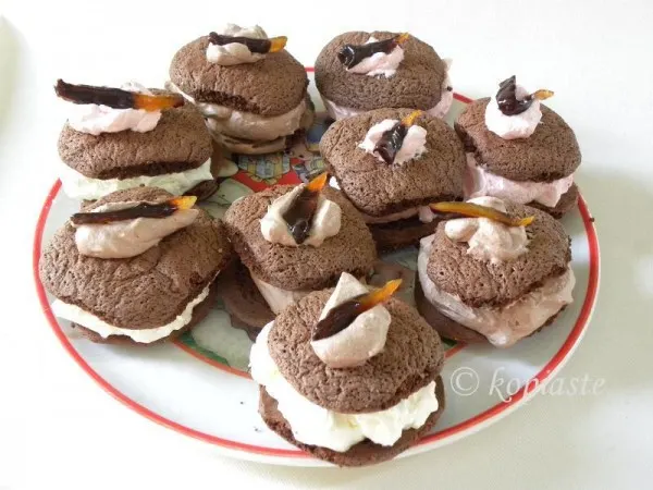 Για τη γέμιση δεν ήθελα να βάλω κρέμα βουτύρου αφενός γιατί δεν ξετρελλαίνομαι και αφετέρου γιατί δεν ήθελα να χρησιμοποιήσω τόσο πολύ βούτυρο σε μια συνταγή. Δεν είναι ένα μικρό μπισκοτάκι όπου μπορείς να βάλεις λίγη. Εδώ χρειάζεται αρκετή για να φαίνεται μέσα και έτσι αποφάσισα να βάλω την κρέμα του τσίζκέικ που λατρεύουμε. Όταν έβαλα τη σοκολάτα να λιώσει έβαλα περισσότερη για να βάλω την υπόλοιπη μέσα στη γέμιση. Αφού τελείωσα με τις φλούδες μάζεψα το ζελέ που περίσσεψε και το ανακάτεψα μέσα στη σοκολάτα. Για να έχω διαφορετικές γεύσεις, μερικά τα άφησα να έχουν γεύση βανίλιας και σε μερικές έβαλα λίγο συρόπι ροδιού που είχα φτιάξει πρόσφατα και η κρέμα έγινε ροζέ. Την τελευταία στιγμή μου ήρθε η έμπνευση να βάλω λίγη κρέμα από πάνω και μια φλούδα πορτοκαλιού για να τα στολίσω από πάνω και ιδού το αποτέλεσμα!