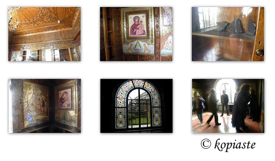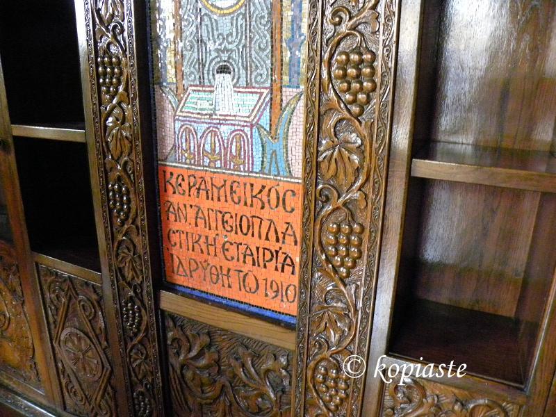Μέσα σε ένα από τα δωμάτια το οποίο ήταν το γραφείο του ιδιοκτήτη, βλέπουμε το ταβάνι και οι τοίχοι να είναι ξύλόγλυπτα, εικόνες από μωσαϊκά, μια βιτρίνα με απολιθώματα ελιάς.