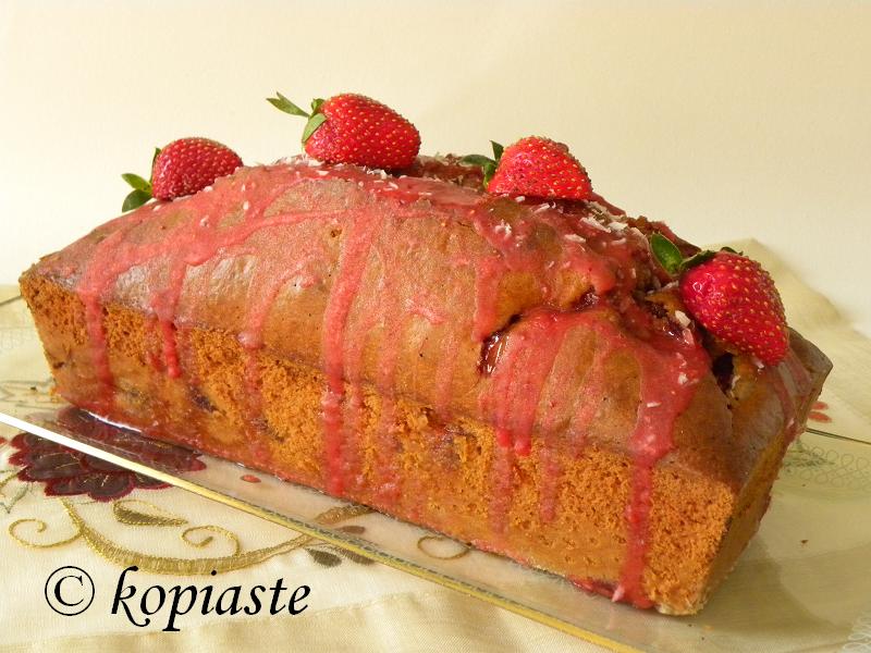 Έκανε ένα σκάσιμο από πάνω που δεν μου άρεσε εμφανισιακά και έτσι σκέφτηκα να το καμουφλάρω λίγο. Έλιωσα στο μούλτι μερικές φράουλες, έβαλα χυμό λεμονιού, ξύσμα λεμονιού και ζάχαρη άχνη κοσκινισμένη, όση χρειάστηκε για να μη γίνει πολύ γλυκό το γλάσο. Το έριξα από πάνω και το άφησα να τρέξει στα πλαϊνά. Μέρος από το συρόπι απορροφήθηκε μέσα στο κέικ, που του έδωσε περισσότερη φραουλένια γεύση και από πάνω πασπάλισα λίγο ινδοκάρυδο και το στόλισα με φρέσκιες φράουλες.