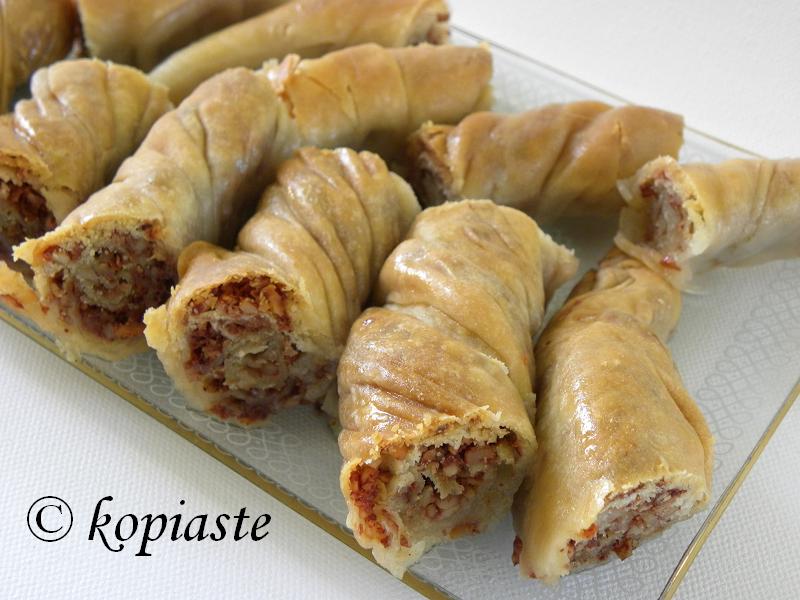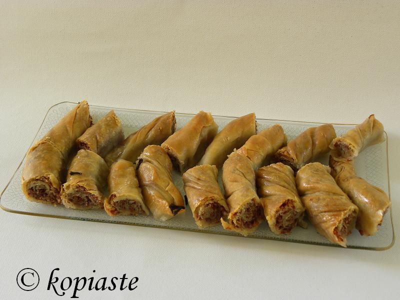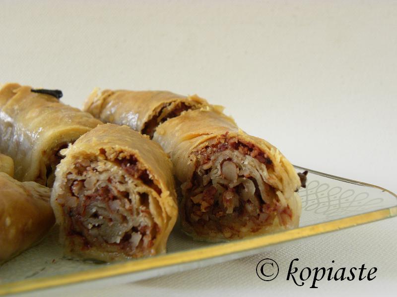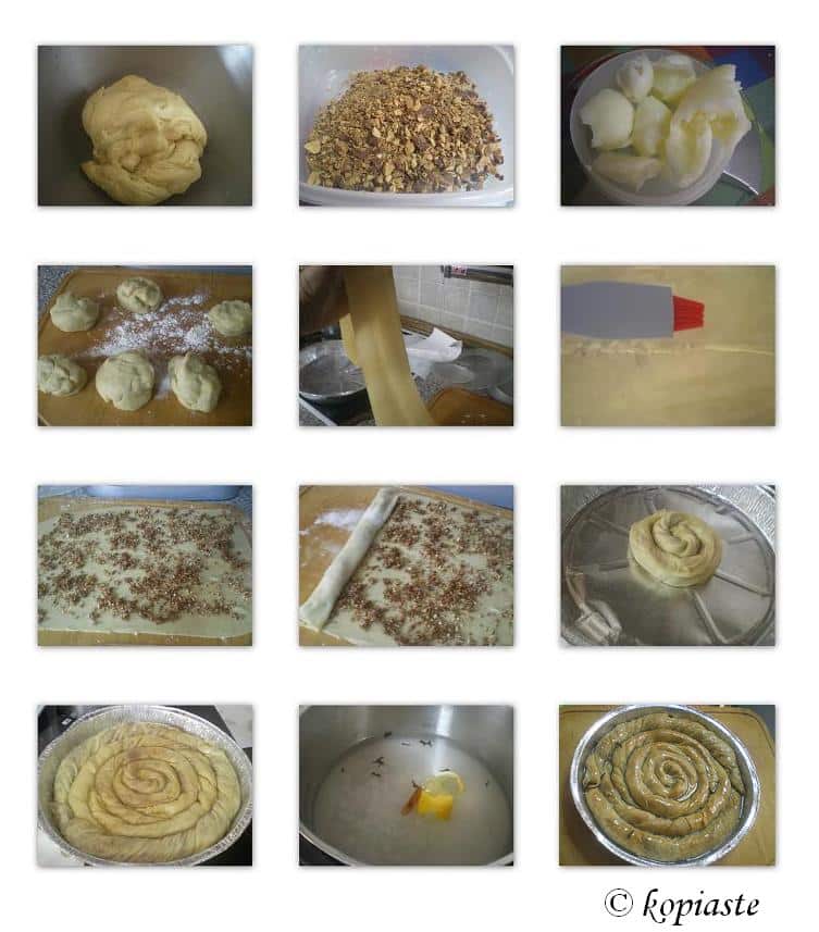 Βουρτσίζουμε ένα ταψί 26 εκ. με βούτυρο και τοποθετουμε το ρολό στο κέντρο, σχηματίζοντας μια σπείρα. Συνεχίζουμε με τα υπόλοιπα 5 κομμάτια. Όταν τελειώσουμε, αλείφουμε από πάνω με βούτυρο.
