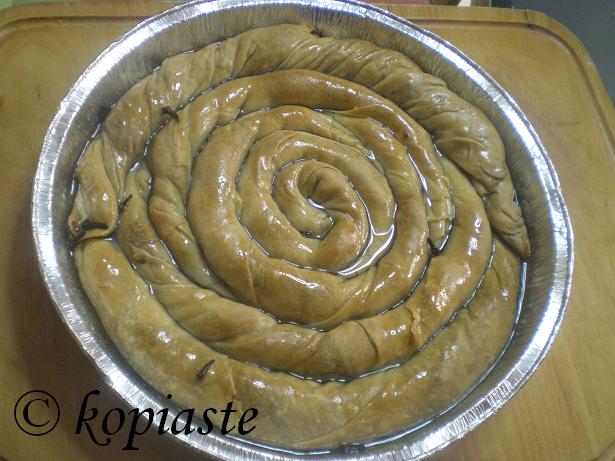 Μόλις το αφαιρέσουμε από το φούρνο προσθέτουμε το σιρόπι και το σκεπάζουμε με πετσέτα μέχρι να απορροφηθεί.