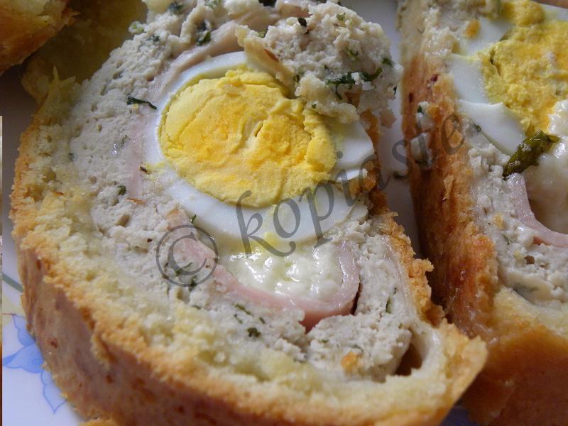 Ένα νόστιμο Ρολό Κιμά με αυγά, γαλοπούλα και γραβιέρα, τυλιγμένο σε φύλλο κουρού.