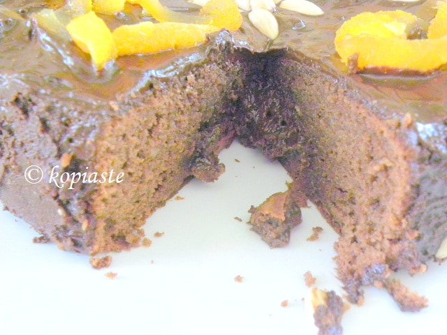 Να πω την αλήθεια δεν έμεινα ευχαριστημένη από τις οδηγίες της συνταγής που μας έδωσαν και εάν δεν ήμουν έμπειρη το κέικ δεν θα πετύχαινε με τίποτε. Μας λέει να δοκιμάσουμε να δούμε εάν ψήθηκε το κέικ βάζοντας μια οδοντογλυφίδα στα 5 – 8 εκατοστά από την άκρη (που είναι αρκετά κοντά στο κέντρο για ένα ταψί 8 ιντζών) και στα 20 λεπτά η οδοντογλυφίδα πρέπει να βγει καθαρή και στο κέντρο να κουνιέται λίγο. Επειδή έκανα μεγαλύτερη δόση ξέρω ότι θέλει και περισσότερο χρόνο να ψηθεί το κέικ και άρχισα να το δοκιμάζω στα 25 λεπτά αλλά ήταν πολύ υγρό. Το ξαναδοκίμασα στα 30 και στα 33 και ήταν υγρό και τελικά αποφάσισα να το βγάλω στα 34 λεπτά. Μετά το γλασάρισμα το κέικ άρχισε να βουλιάζει στο κέντρο. Στη συνταγή μας είπαν να το γλασάρουμε αφού κρυώσει 1 – 2 ώρες μετά το ψήσιμο. Κατά τη γνώμη μου αυτά τα κέικ πρέπει να τα γλασάρουμε όσο είναι χλιαρά και να καταναλώνονται άμεσα όσο είναι λίγο ζεστά ακόμη.