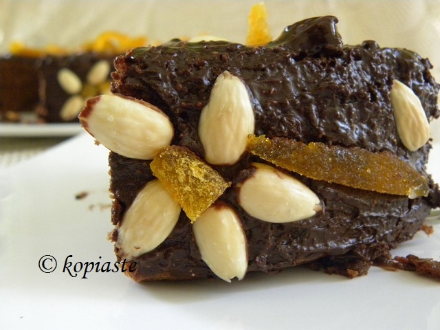Αυτο το σοκολατένιο κέικ δεν θέλει πολύ ψήσιμο για να μείνει λίγο υγρό στη μέση. Από πάνω μπαίνει ένα γλάσο σοκολάτας-βουτύρου και στολίζεται με αμύγδαλα. Επειδή μένει υγρό στη μέση δεν χρειάζεται γέμιση.