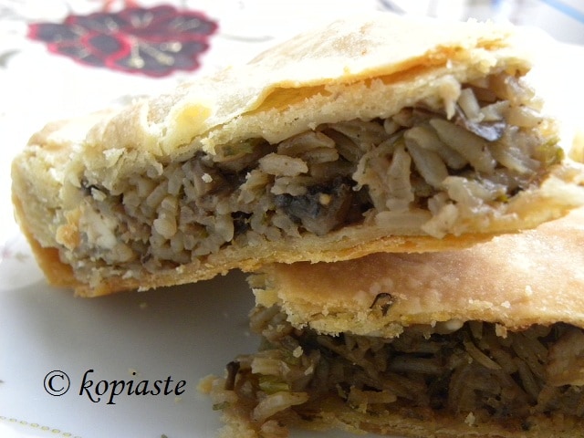 Κάπως έτσι έγινε και αυτή η πίτα. Όταν επισκέφτηκα τα παιδιά μου στην Αθήνα τον περασμένο μήνα είχα βρει στο ψυγείο 1 κουτί μανιτάρια που είχαν αγοράσει και δεν το είχαν χρησιμοποιήσει και λίγο να έμεναν ακόμη θα πήγαιναν για πέταμα. Μου φάνηκαν λίγα τα μανιτάρια και ψάχνοντας στον καταψύκτη βρήκα πιπεριές, που πάντα βρίσκονται στην κατάψυξη, τις οποίες χρησιμοποίησα. Όταν σοτάρισα τα μανιτάρια και τις πιπεριές, κατέβασαν αρκετά υγρά και έτσι έβαλα ρύζι για να απορροφήσει τα υγρά. Έτυχε να έχω ρύζι γιασμίν που είναι αρωματικό, αλλά εσείς μπορείτε να βάλετε είτε ρύζι καρολίνα ή γλασέ ή ακόμη και πλιγούρι. Για τυρί χρησιμοποίησα φέτα γιατί ήταν το μόνο που υπήρχε στο ψυγείο αλλά σίγουρα μπορείτε να βάλετε γραβιέρα, κεφαλογραβιέρα, κεφαλοτύρι, Ελληνικό πεκορίνο, χαλλούμι ή άλλο σκληρό τυρί της αρεσκείας σας.