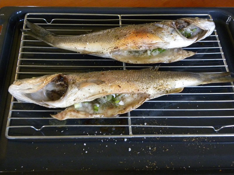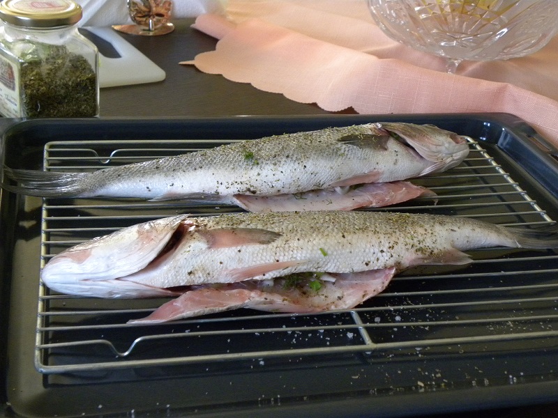 Ο καινούργιος μου φούρνος είναι με αέρα και για να ψήσω τα ψάρια, το έβαλα στο πάνω γκριλ. Έβαλα τα ψάρια σε σχάρα και από κάτω ένα ταψί για να τρέχουν τα υγρά του μέσα. Τα ψάρια δεν χρειάζονται πολλή ώρα να ψηθούν αλλά στο συμβατικό φούρνο μου στην Αθήνα ίσως να ήθελε 10 λεπτά ακόμη,. Επίσης με τον αέρα δεν χρειάζονται γύρισμα.