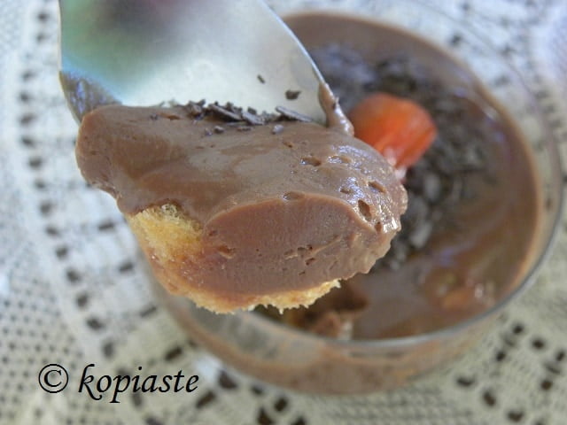 Με αυτές τις πληροφορίες, αποφάσισα να αυτοσχεδιάσω γιατί εάν δεν ρισκάρεις, ποτέ δεν θα βγει κάτι καινούργιο.  Το πολύ-πολύ να μου αποτύγχανε.  Μήπως θα ήταν και η πρώτη φορά; Είχα ήδη στο σπίτι μπισκότα Σαβαγιάρ και σκεφτόμουν να τα στρώσω σε πυρέξ, σε στρώσεις, εναλλάξ με την κρέμα, αλλά πάλι φοβόμουν ότι ίσως να μην έπηζε αρκετά.  Έτσι αποφάσισα να στήσω το γλυκό σε μπωλάκια.   Μέχρι να κάνω την υπόλοιπη ετοιμασία για να φτιάξω το γλυκό, ήδη η κρέμα είχε σταθεροποιηθεί.  Τα μπισκότα, τα αρωμάτισα με λικέρ Φράουλας, που είχα φτιάξει πριν μερικά χρόνια.  Εάν δεν έχετε λικέρ φράουλας βάλτε άλλο λικέρ της αρεσκείας σας, όπως πορτοκάλι ή λεμόνι ή κεράσι που ταιριάζουν με τη σοκολάτα.