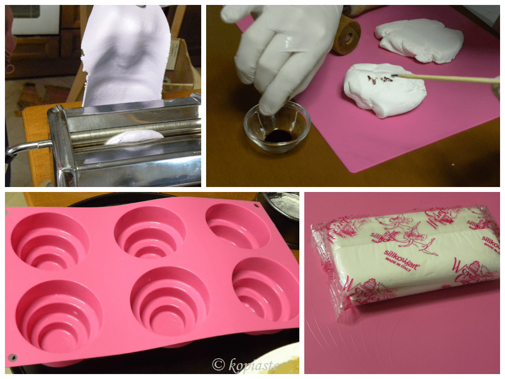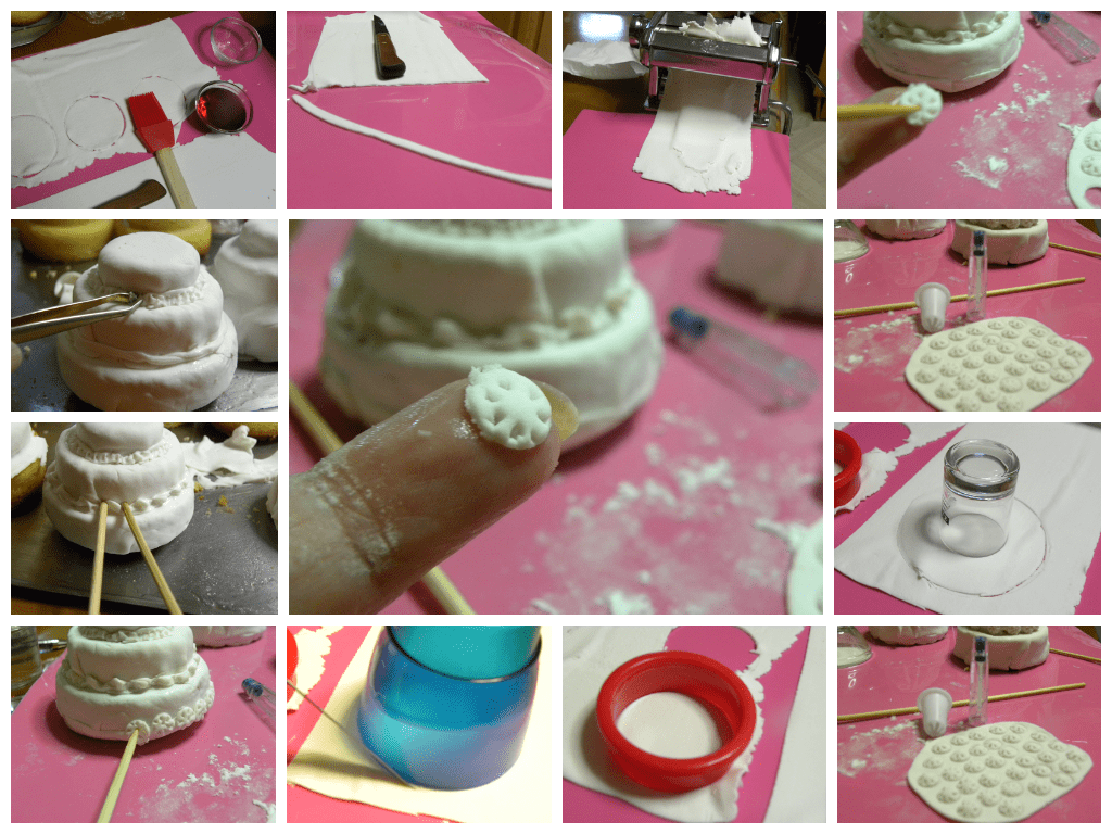 Μην κρίνετε την εμφάνιση των δικών μου γιατί τα έφτιαξα χωρίς κανένα επαγγελματικό εργαλείο. Επιστράτευσα τη φαντασία μου και χρησιμοποίησα τη μηχανή που ανοίγουμε φύλλο, διάφορα μεγέθη ποτηράκια και κουπάμ μπισκότων για να τα κόψω, τσιμιδάκι, καλαμάκια, μύτη κορνέ και καπάκι από στυλό, για να τα στολίσω. Για επαγγελματική χρήση, υπάρχουν άλλα φορμάκια που θα βγάλετε ότι σχέδιο θέλετε σε τέλεια μορφή.