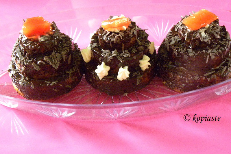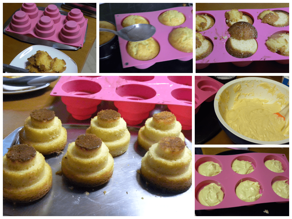- Τα αφήνουμε να κρυώσουν και με ένα κοφτερό μαχαίρι κόβουμε τις στρογγυλεμένες κορφές για να μπορούν να σταθούν ανάποδα τα κεκάκια.