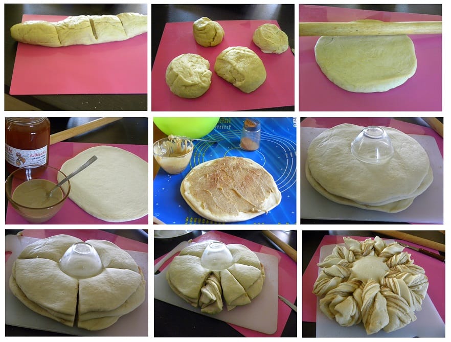 - Τοποθετούμε ένα στρογγυλό αντικείμενο (ποτήρι ή πιατάκι) στο κέντρο σαν οδηγό και με ένα κοφτερό μαχαίρι διαιρούμε τη ζύμη σε τέσσερα ίσα μέρη. Κόβουμε το κάθε τέταρτο σε άλλα τέσσερα μέρη, ώστε τα κομμάτια να γίνουν δεκαέξι.