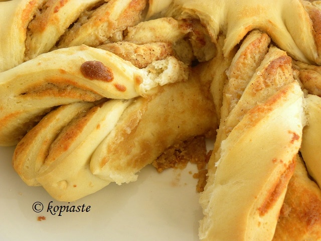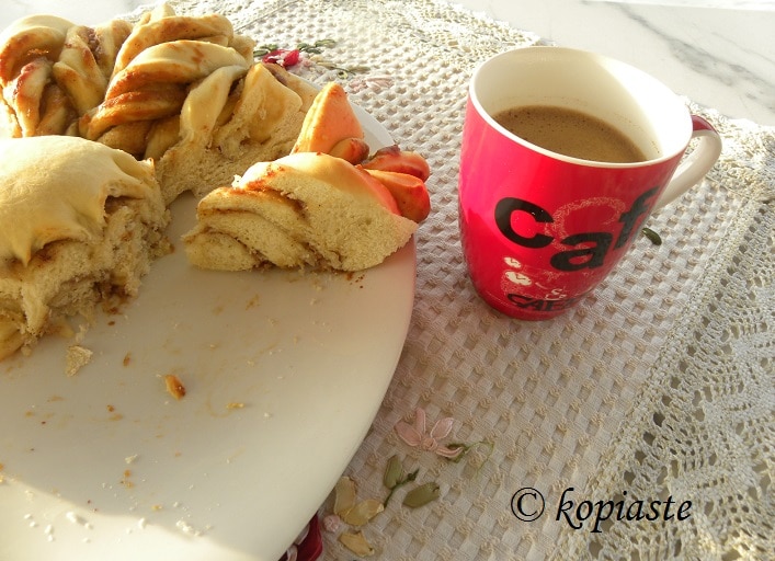 Η βάση είναι μια ζύμη με μαγιά, όπως εκείνη που φτιάχνουμε για πίτσα. Για γέμιση έβαλα ταχίνι με μέλι και κανελά. Το μέλι μπορείτε να το αντικαταστήσετε με ζάχαρη.