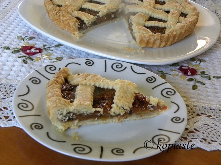 Δεν ξέρω πώς είναι η παραδοσιακή συνταγή αλλά η τραγανή, τριφτή και βουτυράτη ζύμη της τάρτασ και η γέμιση από το συνδυασμό όλων αυτών των φρούτων με τα μπαχαρικά, έδωσαν ένα υπέροχο αποτέλεσμα, τέλειο για οποιαδήποτε ώρα της ημέρας με καφέ, τσάι ή άλλο ρόφημα.