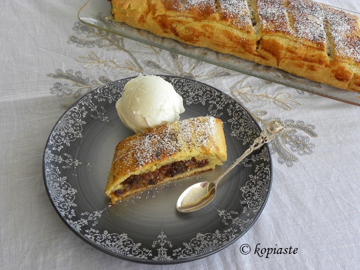 - Πασπαλίζουμε με ζάχαρη άχνη από πάνω και σερβίρουμε, κατά προτίμηση με παγωτό καϊμάκι.