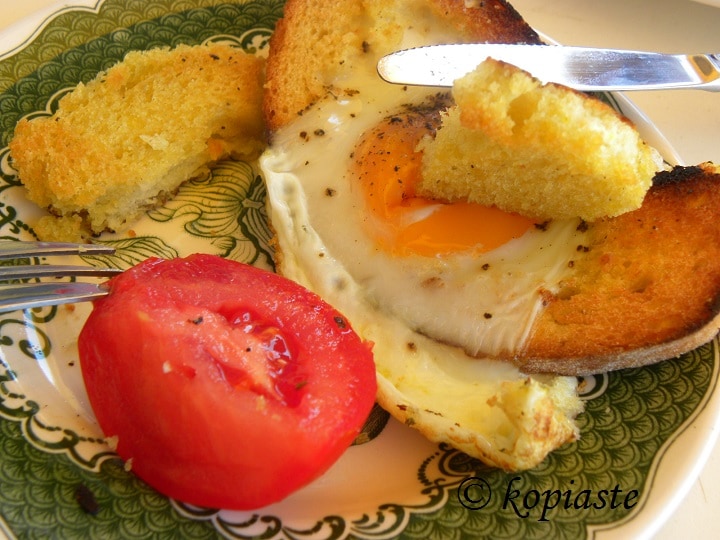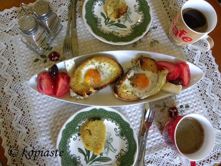 Η ιδέα αυτή με το αυγό στη μέση είναι ξενόφερτη αλλά μην ξεχνάμε ότι φέτες με ψωμί, ψητές στα κάρβουνα με ελαιόλαδο, αλάτι, πιπέρι και ρίγανη είναι κάτι που συνηθίζεται στην Ελλάδα από παλιά και σερβίρονται σε πολλά εστιατόρια είτε σκέτες για να συνοδεύσουν άλλα φαγητά ή με κάποια υλικά από πάνω, σε στυλ μπρουσκέτας, αλά Ιταλικά.