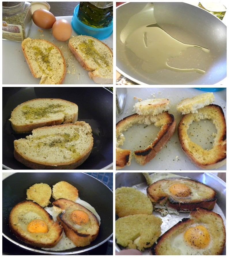 Αυτές οι φέτες με το αυγό στη μέση είναι το κάτι άλλο. Οι φέτες βρέχονται με ελαιόλαδο, πασπαλίζονται με αλάτι, πιπέρι και ρίγανη και τηγανίζονται. Πριν το τέλος αδειάζει η ψίχα και μέσα μπαίνει το αυγό. Τελειώνει στο φούρνο για να ψηθεί το αυγό από πάνω. Το ψωμί φρυγανίζεται και γίνεται τραγανό, όλο άρωμα και γεύση. Το αυγό μελάτο με φρέσκο πιπεράκι από πάνω και το ψωμάκι που βγάλαμε από το κέντρο έτοιμο για τη βούτα. Σκέτη κολαση!