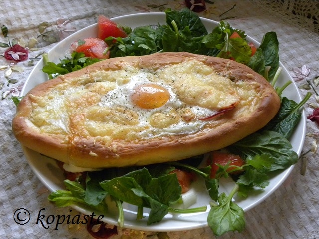 Επίσης να μην ξεχνάμε ότι κάτι παρόμοιο είναι και το δικό μας Πεϊνιρλί που γίνεται με ζύμη με μαγιά, μπέικον, τυρί και αυγό από πάνω.  (Φωτογραφία από το βιβλίο μου “More Than A Greek Salad”).