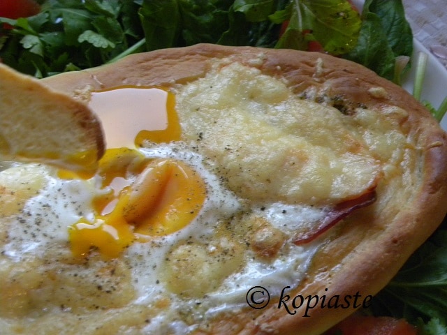 Επίσης να μην ξεχνάμε ότι κάτι παρόμοιο είναι και το δικό μας Πεϊνιρλί που γίνεται με ζύμη με μαγιά, μπέικον, τυρί και αυγό από πάνω. (Φωτογραφία από το βιβλίο μου “More Than A Greek Salad”).