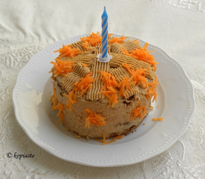 - Διακοσμούμε το κείκ με ένα πιρούνι και πασπαλίζουμε με τριμμένο καρότο από πάνω.