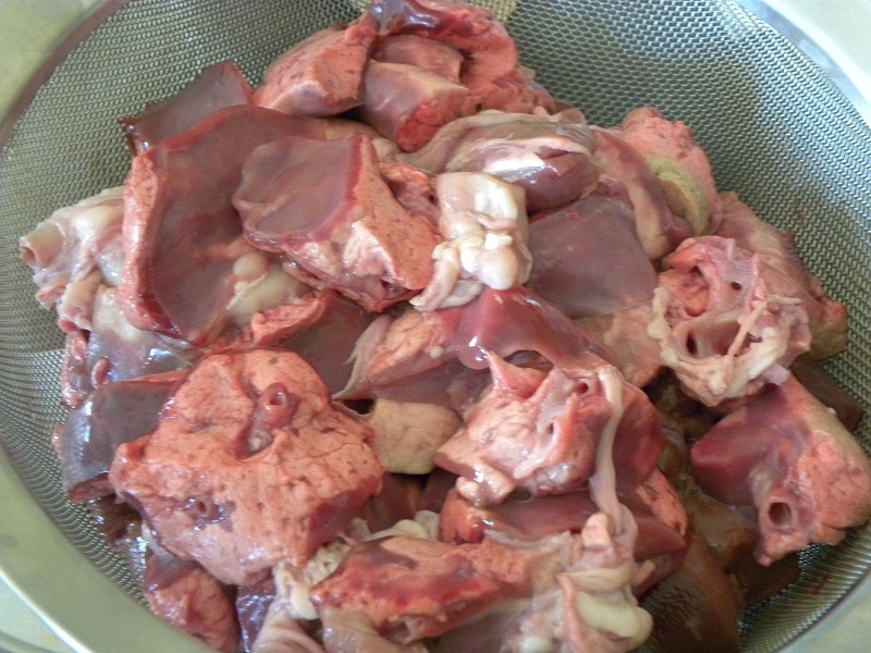 - Πλένουμε τη συκωταριά, την κόβουμε σε μικρά κομμάτια και την αφήνουμε να στραγγίξει. (Εναλλακτικά, μπορούμε να χρησιμοποιήσουμε συκωτάκια κότας).