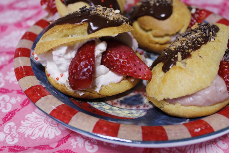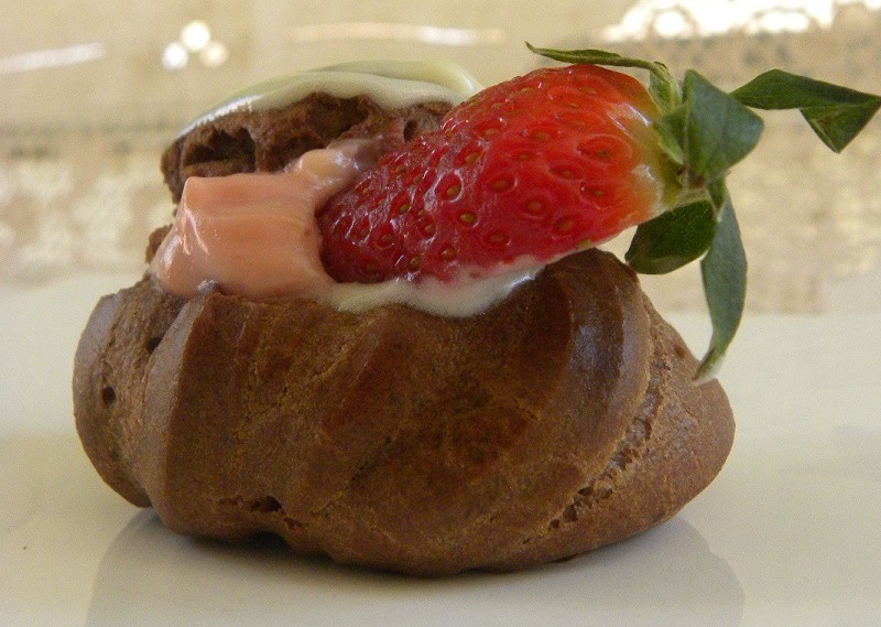 Εκλαίρ με Μους Φράουλας, φρέσκες φράουλες και Γκανάς Σοκολάτας.