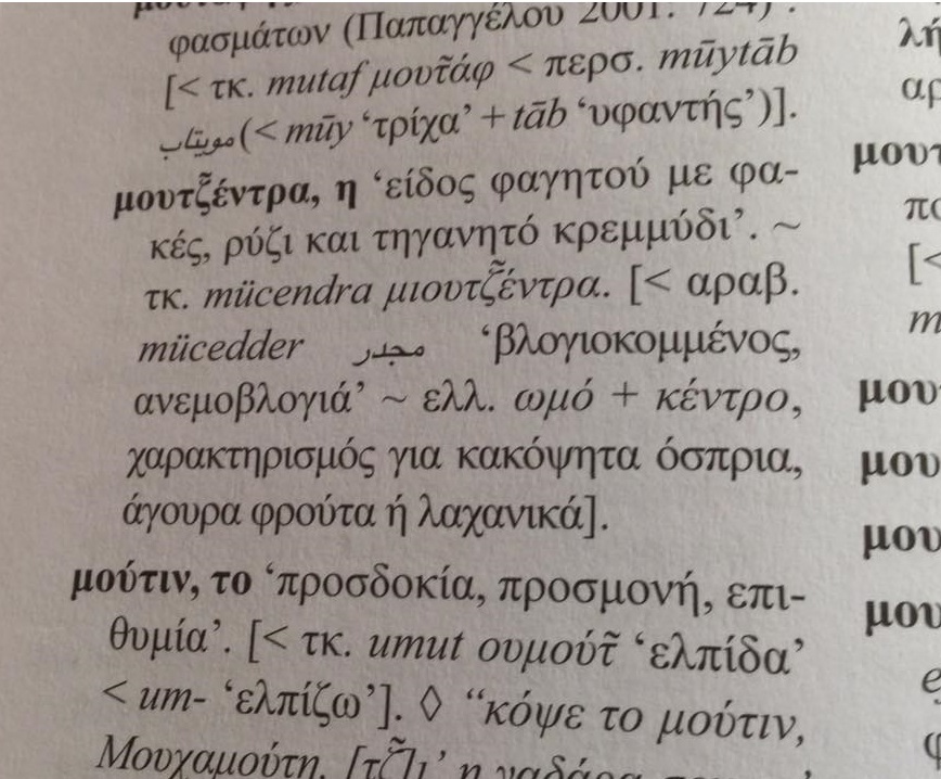 Σύμφωνα με αυτούς τους συγγραφείς, η ερμηνεία της λέξης μουτζέντρα είναι διαφορετική. Περιγράφουν την μουτζεντρα σαν είδος φαγητού με φακές, ρύζι και τηγανητό κρεμμύδι. Η Ελληνική ερμηνεία της λέξης όμως προέρχεται από το ωμό + κέντρο, χαρακτηρισμός για κακόψητα όσπρια, άγουρα φρούτα ή λαχανικά.
